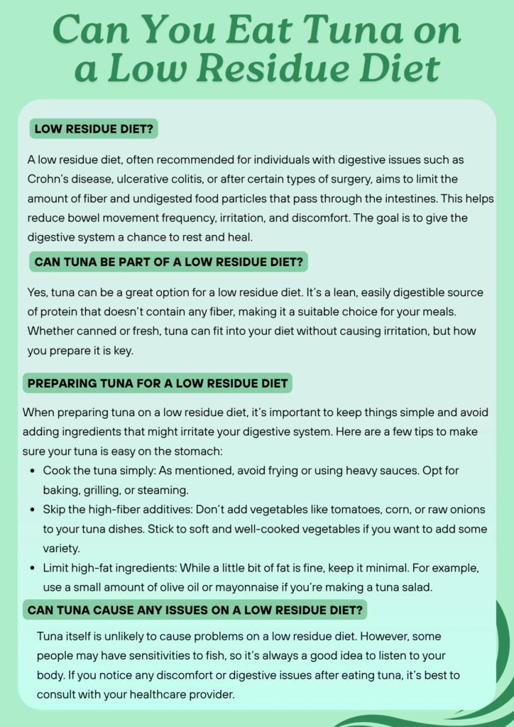 Tuna itself is unlikely to cause problems on a low residue diet. However, some people may have sensitivities to fish, so it’s always a good idea to listen to your body. If you notice any discomfort or digestive issues after eating tuna, it’s best to consult with your healthcare provider.